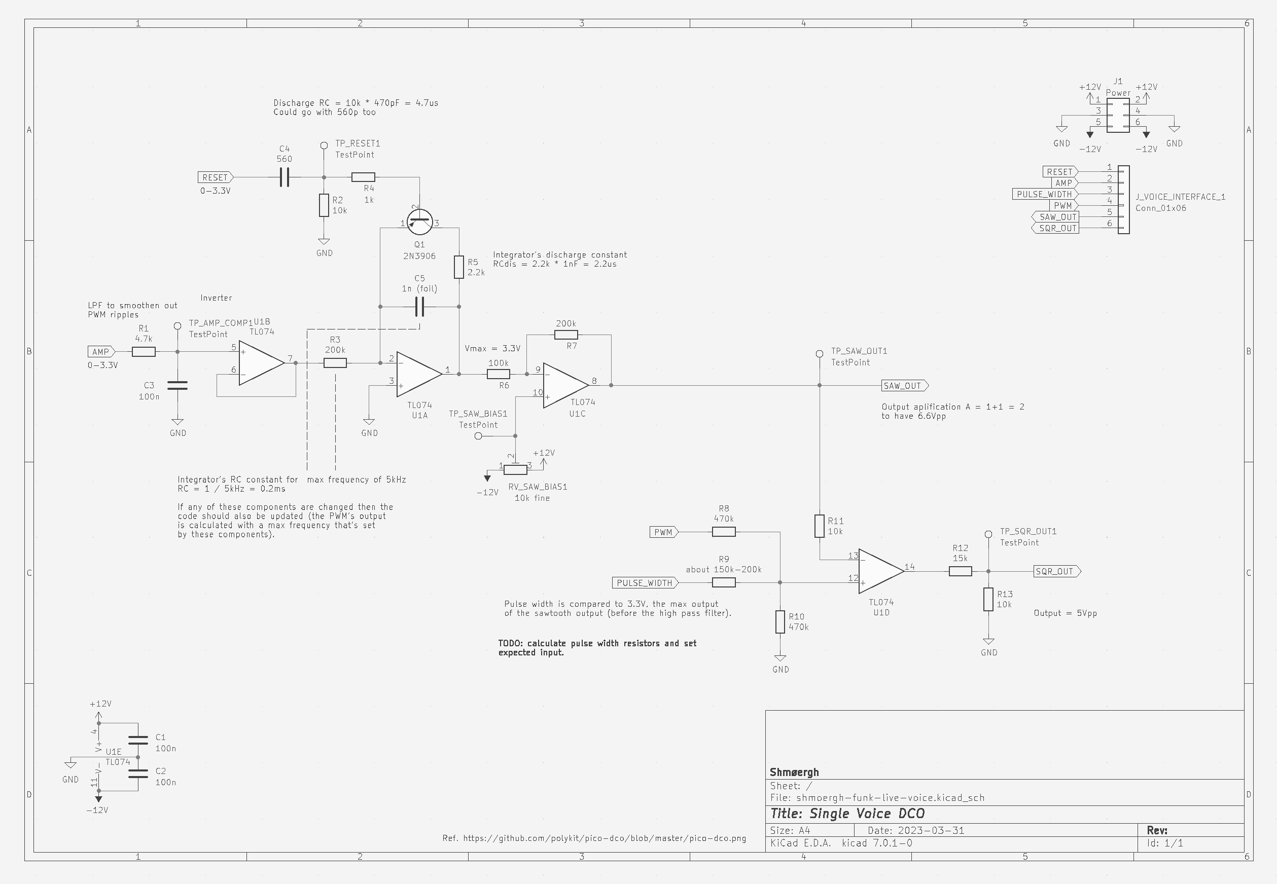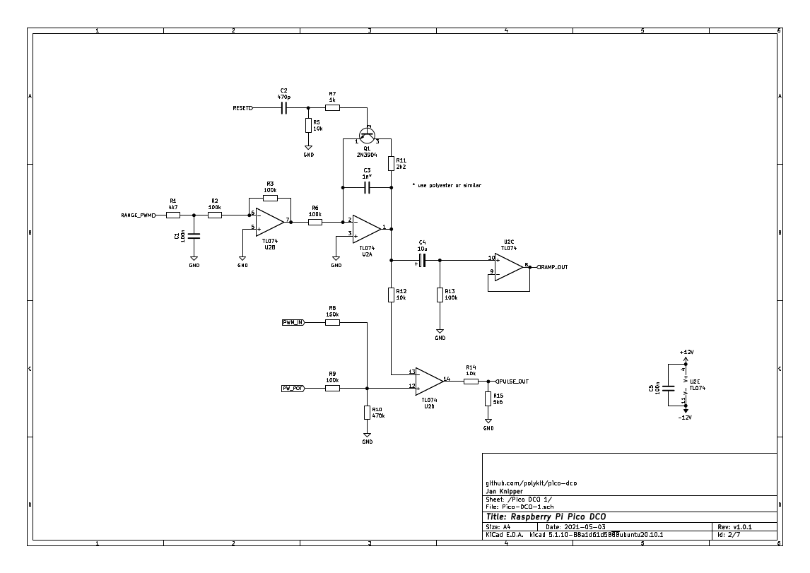 My microcontroller of choise these days is the Raspberry Pi Pico. Thankfully there's an open-source DCO implementation and schematic available by Polykit in his Pico-DCO repository. This is the basis of my design too, however I ended up changing the circuit design and the code in order to fit the paraphonic use case better.