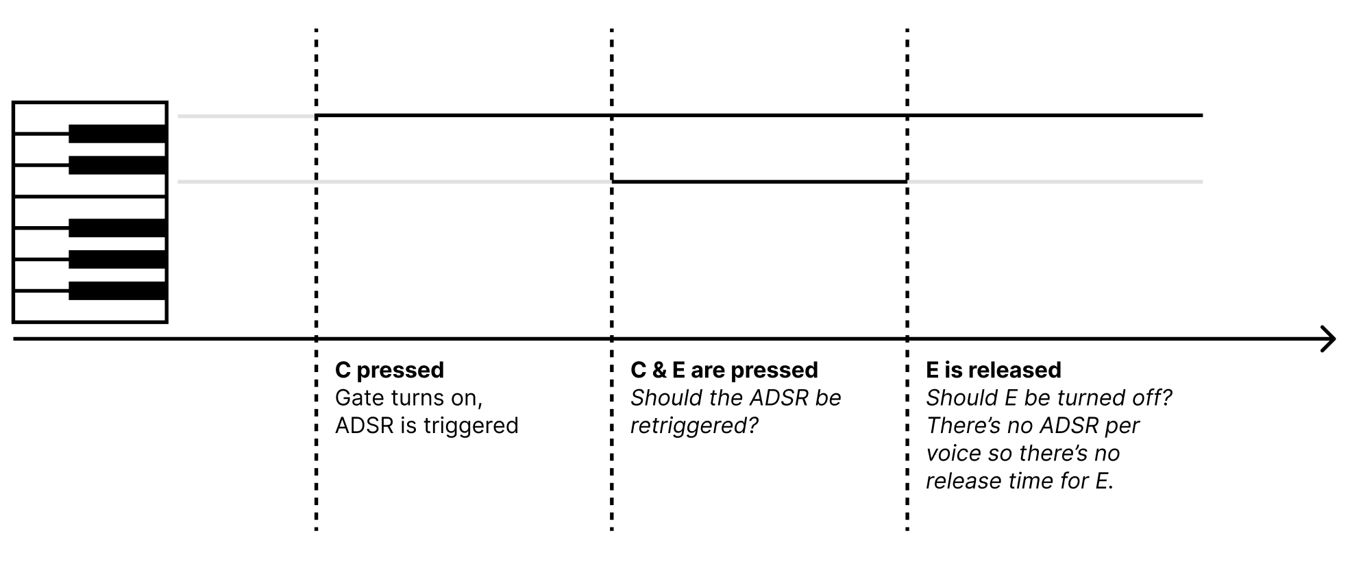 onand a single note is played. - I press an E note while keeping the C pressed. Should we retrigger the ADSR?